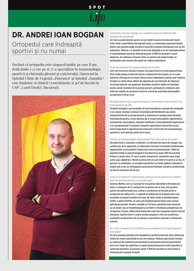 Ele determina o cascada a vindecarii, cu formarea de tesut de colagen sau cartilaj nou, bine organizat, si restaurarea structurii si functiilor tendoanelor, ligamentelor si articulatiilor. Experienta mea insumeaza peste 1.000 de pacienti tratati cu plasma cu aditie de trombocite si peste 300 de pacienti tratati cu celule specifice. In cazul acestor tratamente, rezultatele apar dupa 4-6 saptamani. Marele avantaj este ca sunt minim invazive si se fac, in general, in ambulator, cu exceptia injectarilor la nivelul soldului; dureaza in medie sub o ora, iar reintegrarea pacientului familiala, sociala si profesionala se face in maximum 24 de ore.Aveti un rol important in dezvoltarea sistemului de recuperare numit ReFlex. Cum functioneaza acesta si cui se adreseaza?