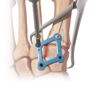 If there is a fracture of the metatarsal bases or cuneiform bones, we use dorsal plates to stabilize the corresponding joint. However, we always use the one known as the "Lisfranc screw" between the first cuneiform bone and the base of the second metatarsal.