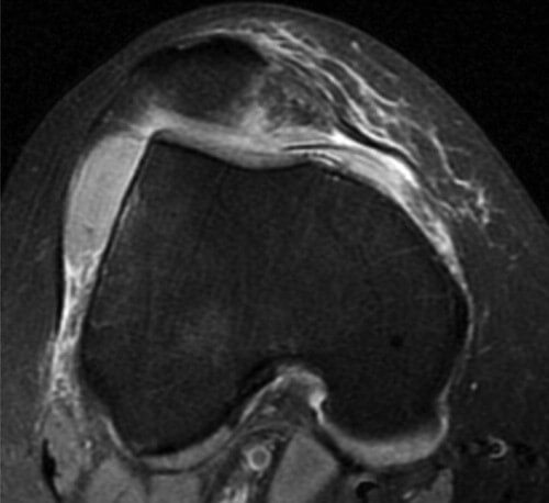 Retinacul patelar medial remarca o crestere in grosime, cu aspect lax, partial dezorganizat fibrilar si modificari de semnal intra- si periligamentare la nivelul insertiei sale patelare, cu mic fragment osos al versantului medial patelar avulsionat. Aspectele IRM sunt sugestive pentru o leziune a retinacului medial 1/3 anterioara.